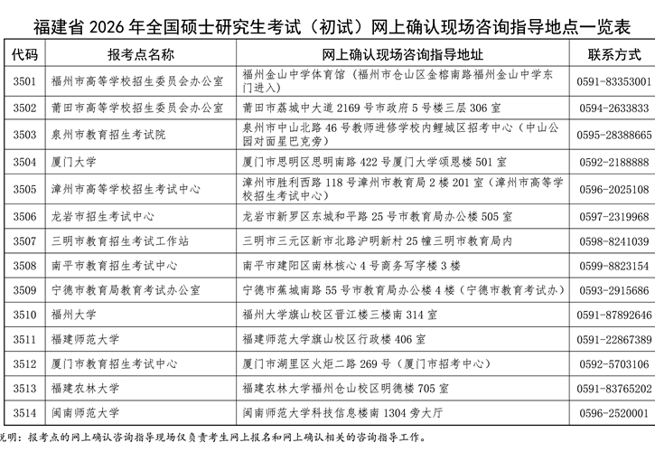 附件:福建省2026年全國(guó)碩士研究生考試(初試)網(wǎng)上確認(rèn)現(xiàn)場(chǎng)咨詢指導(dǎo)地點(diǎn)一覽表