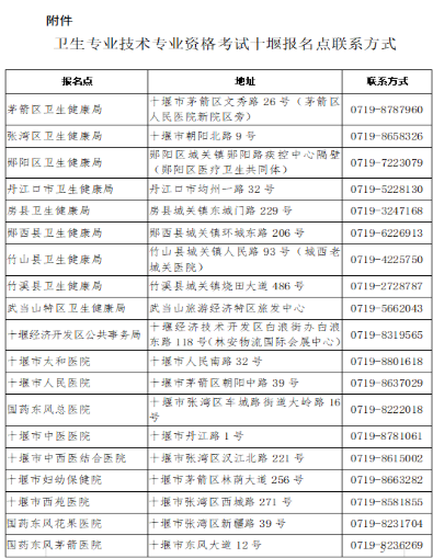 附件:衛(wèi)生專業(yè)技術(shù)專業(yè)資格考試十堰各報(bào)名點(diǎn)聯(lián)系方式