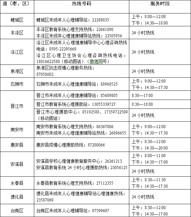 據(jù)泉州市教育局思政科有關負責人介紹,為保障廣大學生以陽光健康的心態(tài)開展居家學習生活,泉州市本級和各縣(市、區(qū))開通了20條學生心理服務熱線,向受疫情影響需要情緒疏導,以及對自身健康存有疑慮,需要心理支持的學生群體提供公益性咨詢服務。全市學生心理服務熱線如下: