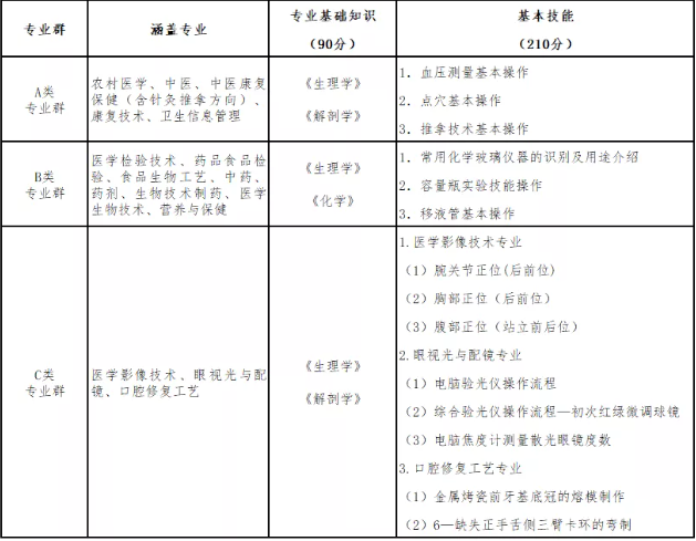 根據(jù)省教育廳下發(fā)的《山西省中等職業(yè)學(xué)校畢業(yè)生對(duì)口升學(xué)考試醫(yī)學(xué)相關(guān)類(lèi)專(zhuān)業(yè)職業(yè)技能考試大綱(試行)》,本專(zhuān)業(yè)職業(yè)技能考試分專(zhuān)業(yè)基礎(chǔ)知識(shí)考試和基本技能考試兩部分,滿(mǎn)分300分,其中,專(zhuān)業(yè)基礎(chǔ)知識(shí)占90分,基本技能占210分,考試成績(jī)結(jié)果體現(xiàn)為“合格”和“不合格”??荚噧?nèi)容如下: