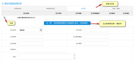 3.在江蘇省參加全國計算機等級考試(NCRE)的考生使用合格證書用于申請免考的,須按以下流程進行“一鍵免考”:請直接選擇證書類→勾選出現(xiàn)的信息(如未出現(xiàn)可勾選的信息,須自行核對NCRE證書信息中的身份證號碼及姓名是否與本系統(tǒng)中的信息相符)→勾選后點擊藍色按鈕(如圖1)→直接得到免考審核結(jié)果。